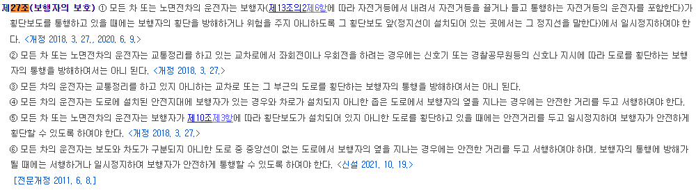 얼마 전 2022. 1. 11. 도로교통법 개정이 있었습니다. (시행은 2022. 7. 12.) 화제의 내용인도로교통법 제27조(보행자의 보호)를 살펴 보겠습니다. 일반인들에게 알려진 횡단보도 앞 우회전 일시정지로 많이 알려져 있는데요 뉴스에 많이 알려진 내용이라 그런지 우회전시에무차별적으로일시정지 하는 운전자들이 늘어남에 따라 차량정체도 많이 늘어 난 것을 알 수 있습니다.