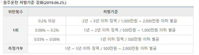 처벌은 혈중 알코올 농도의 수치에 따라 구분되어 있는데요, 0.2% 이상은 무조건 가장 최고의 처벌을 받을 수 있습니다.