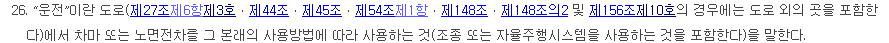 제44조 1항에는 누구든지 술에 취한 상태에서 자동차 등, 노면전차 또는 자전거를 운전하여서는 안된다고 정의하고 있습니다.
