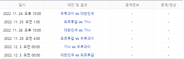 2022. 11. 24. 22:00. 우루과이(18위) VS 대한민국(28위)