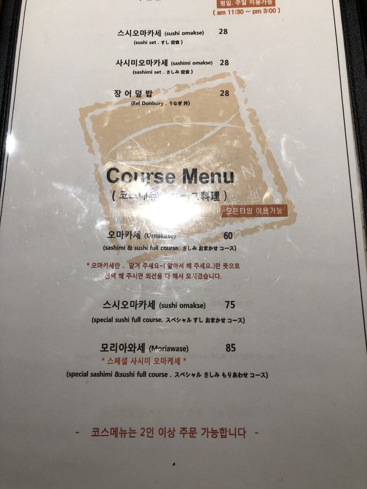 메뉴는 오마카세, 스시오마카세, 모리아와세 세 종류가 있습니다.